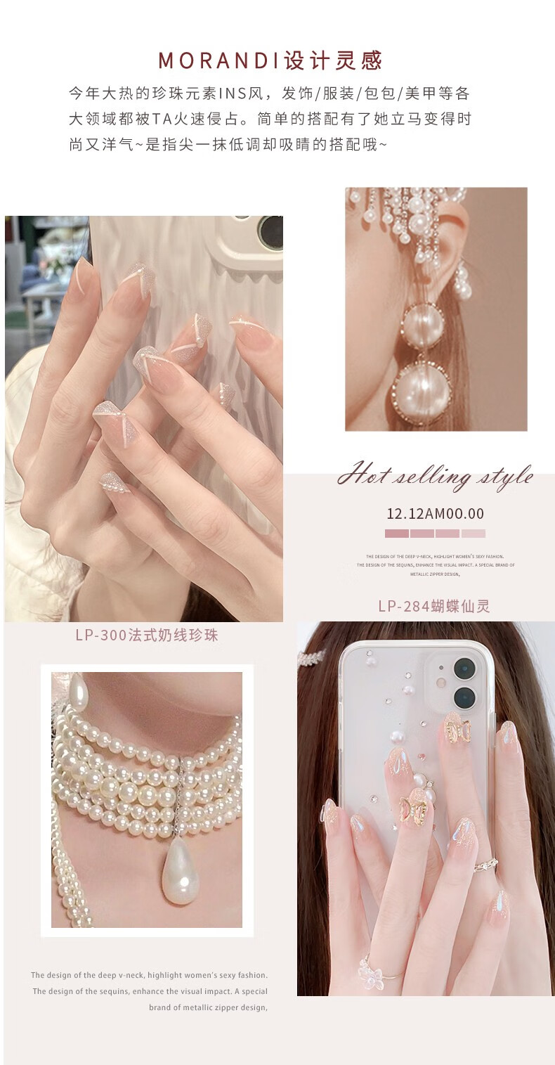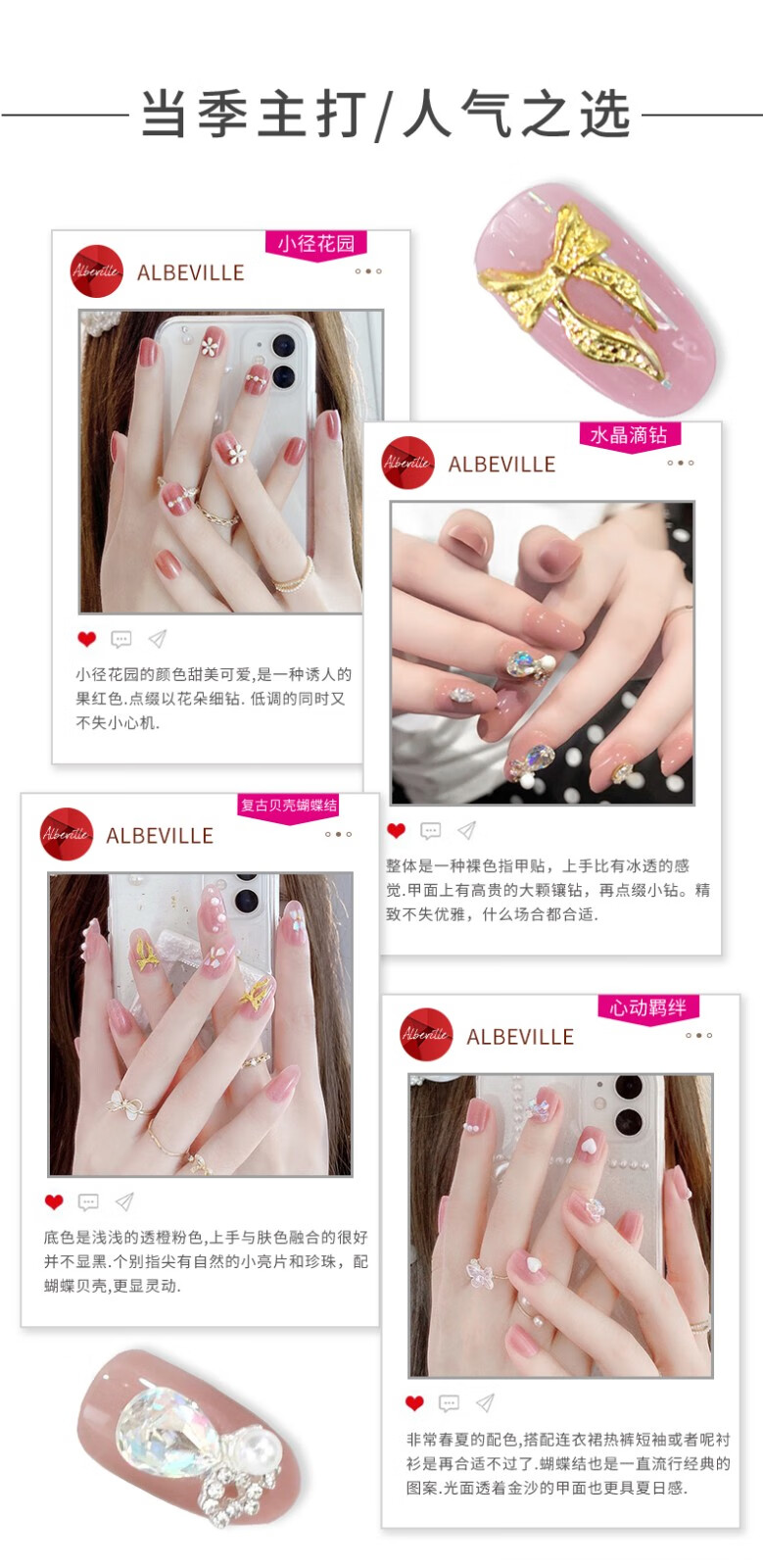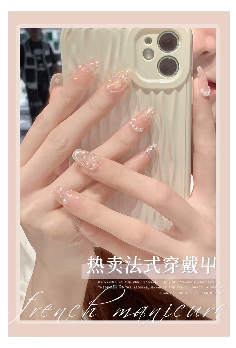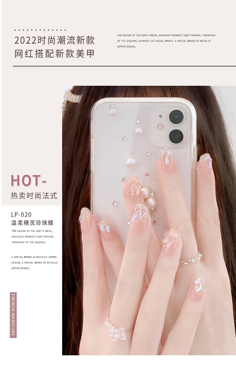 Albeville立体手工法式裸色穿戴甲2023年新款中长高级感蝴蝶指甲贴片魔镜粉LP-494【24片】浪漫花园
